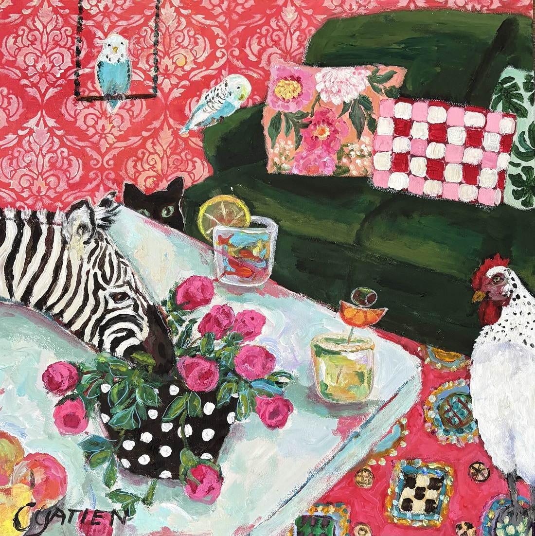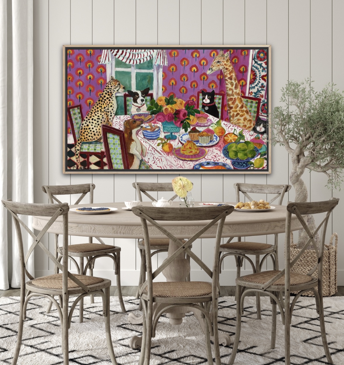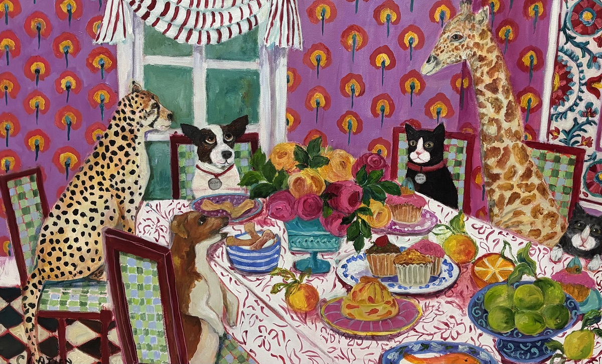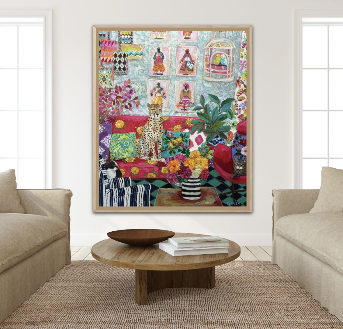 Sometimes I think this is where my heart is. With these paintings, I’m able to explore my love of patterns and textiles, design my own pottery collection, make my plants green and healthy (I wish my own plants looked this good), include a favourite animal or two—sometimes a cat or dog, and other times something more exotic like a giraffe or zebra—and then find room for some vibrant florals. Hopefully, these elements will result in a winning combination, lighting up a room and making people who see them feel good. To keep things simple, I’ve included my tablescapes/still lifes in this section but there is always a certain amount of crossover in my paintings.