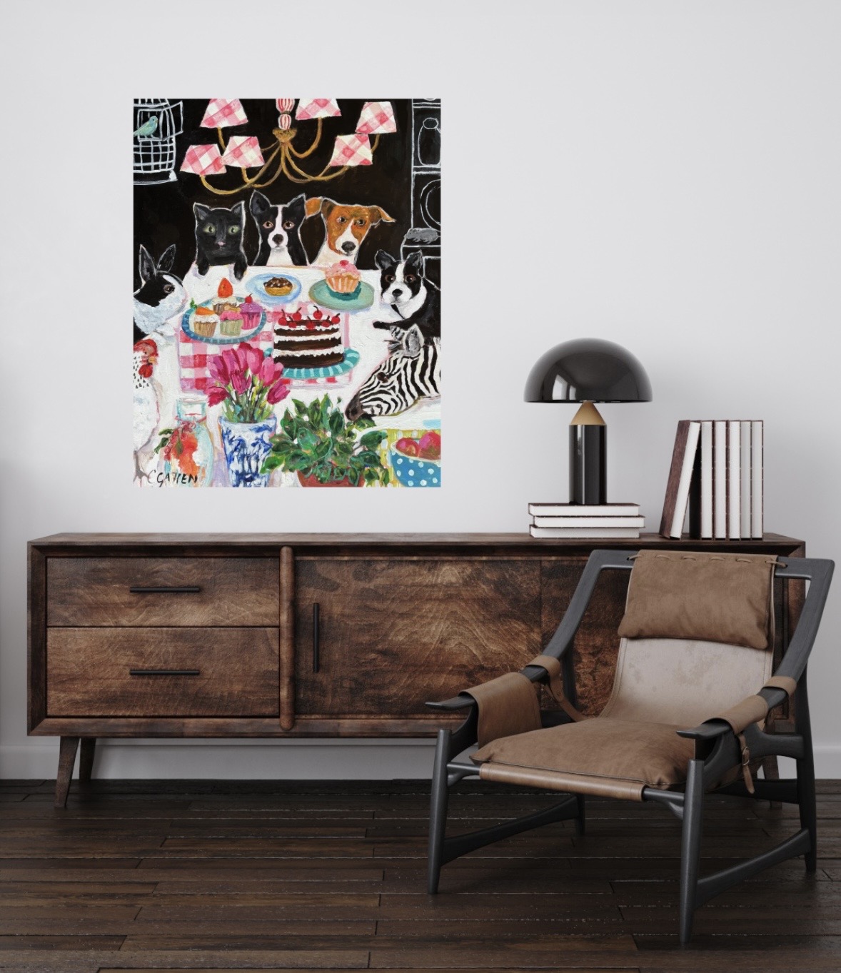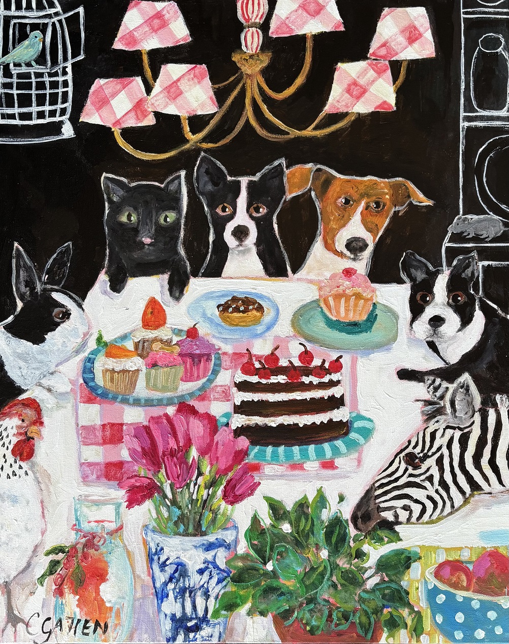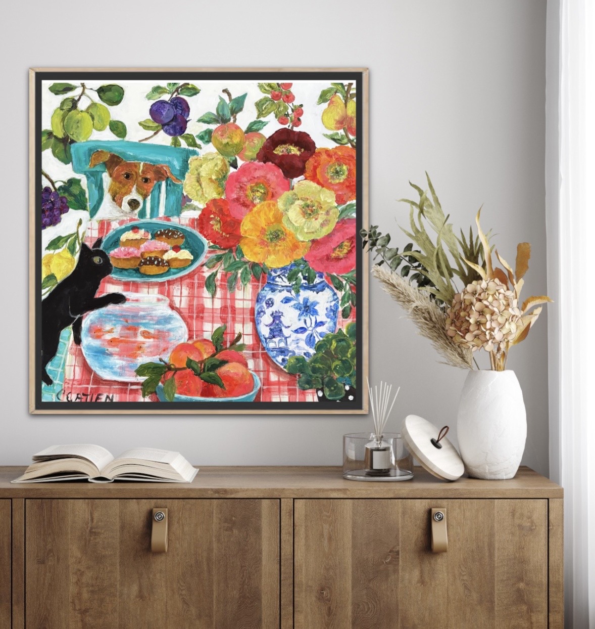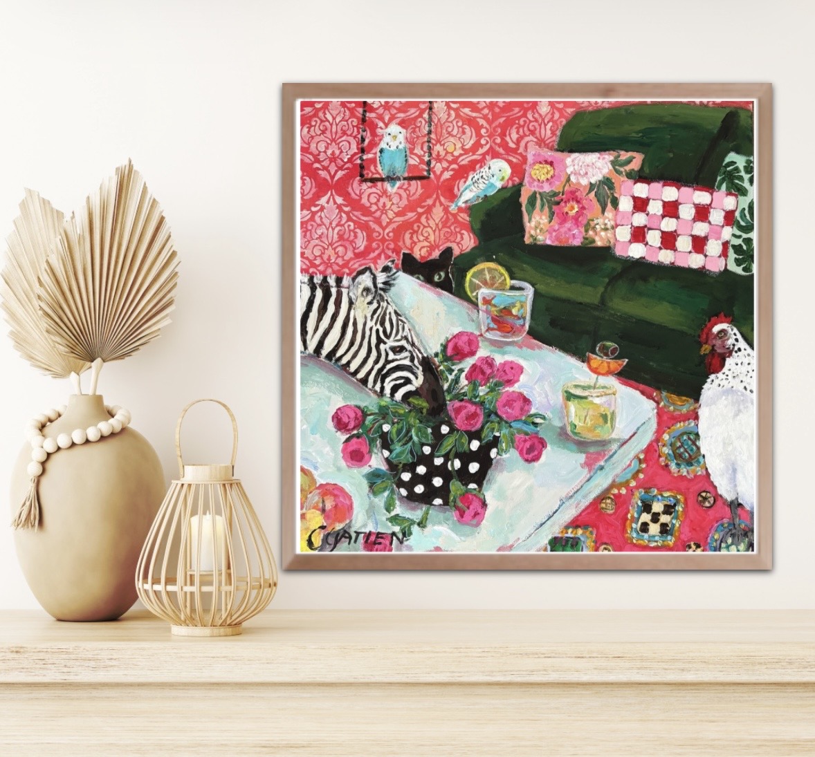 Sometimes I think this is where my heart is. With these paintings, I’m able to explore my love of patterns and textiles, design my own pottery collection, make my plants green and healthy (I wish my own plants looked this good), include a favourite animal or two—sometimes a cat or dog, and other times something more exotic like a giraffe or zebra—and then find room for some vibrant florals. Hopefully, these elements will result in a winning combination, lighting up a room and making people who see them feel good. To keep things simple, I’ve included my tablescapes/still lifes in this section but there is always a certain amount of crossover in my paintings.